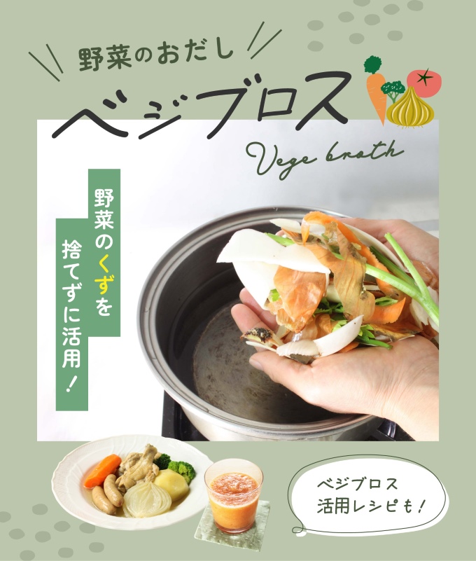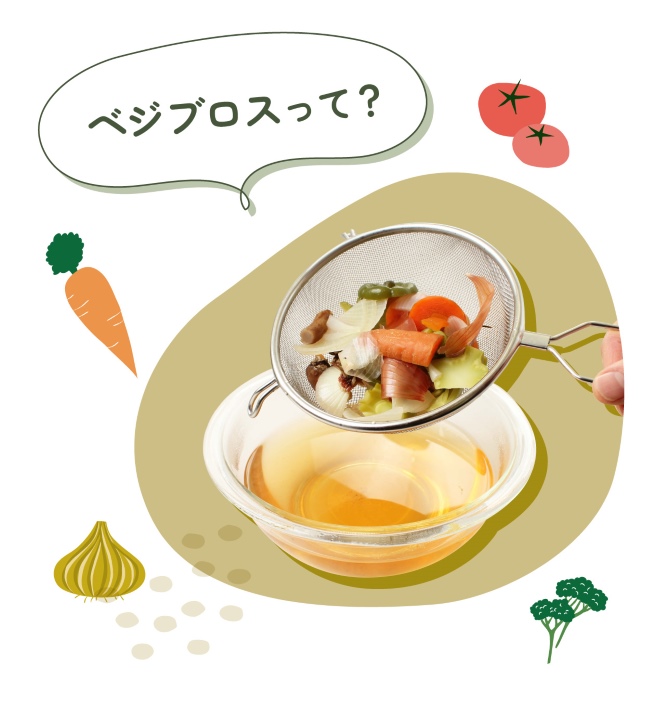 「ベジブロス」とは、ベジ(野菜)とブロス(だし汁)を組み合わせた言葉で、野菜を煮込んで取るだしのこと。