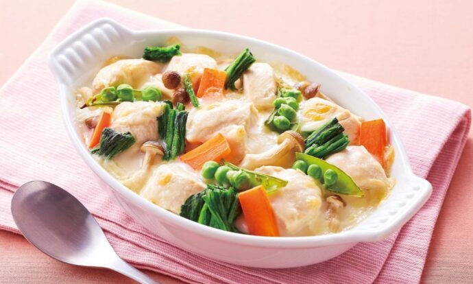 弱火にして、具材の中心にバターを加え、溶けたら薄力粉を加えダマにならないよう混ぜ合わせる。牛乳を少しずつ足してゆっくり混ぜ、コンソメを加えて味付けする