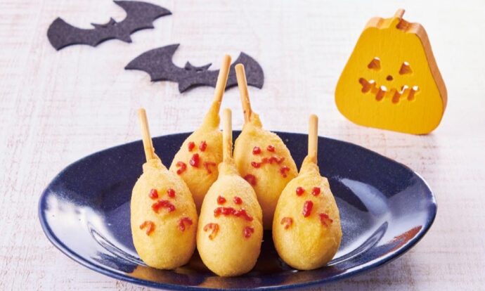 トマトケチャップでミニアメリカンドッグに顔を描く。手は楊枝の上の部分を使って描く.