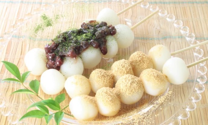 団子を串にさし、好みできなこと黒蜜、あんと抹茶をかけていただく。