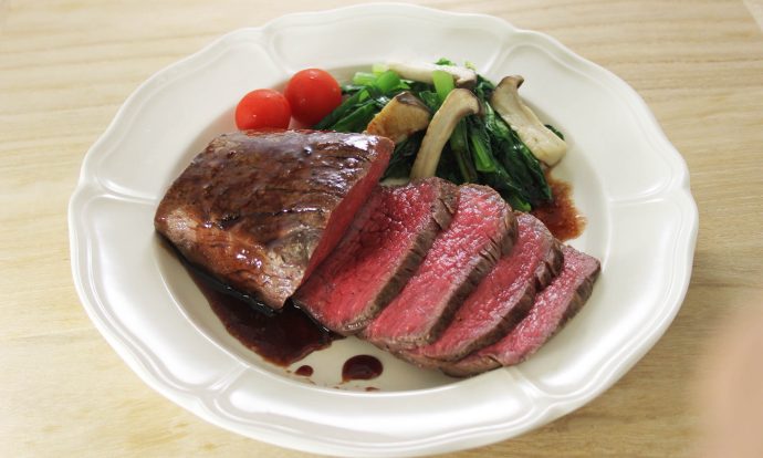 フライパンにオリーブ油大さじ1/2を熱し、エリンギを1~2分炒める。小松菜の茎を加えて炒め、しんなりしたら小松菜の葉も加えて炒める。塩こしょうで調味し、ローストビーフに添え、ミニトマトも添える。お好きなソースをかけてどうぞ。
