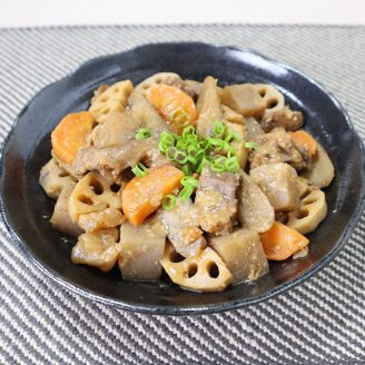 別の鍋に油を熱し、玉ねぎを入れて炒め、しんなりしたらにんじん、じゃがいも、しめじを加えて全体に油が回るまで炒める。①の茹で汁と水を合わせて400ccと牛すじを加えて強火にかける。煮立ったら蓋をして、弱火で約20~30分、野菜に火が通るまで煮る。一旦火を止め、デミグラスソースを溶かし、弱火でとろみがつくまで煮たらトマトケチャップを加えて味を調える。ブロッコリーを加えさっと煮る。