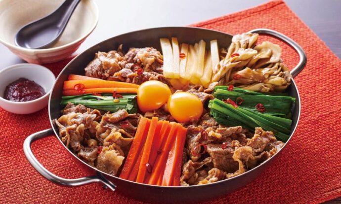 フライパンにごま油を塗り、牛肉を4か所に等分に置き、にんじん、大根、まいたけを肉の間に真ん中をあけて放射状に並べる。火にかけて焼肉のタレ大さじ3と水1/4カップ、一味唐辛子ふり、蓋をして肉に火が通って野菜がしんなりするまで煮る。にらを加えて卵を真ん中に割り入れる。蓋をし、卵が半熟状になるまで煮る。
