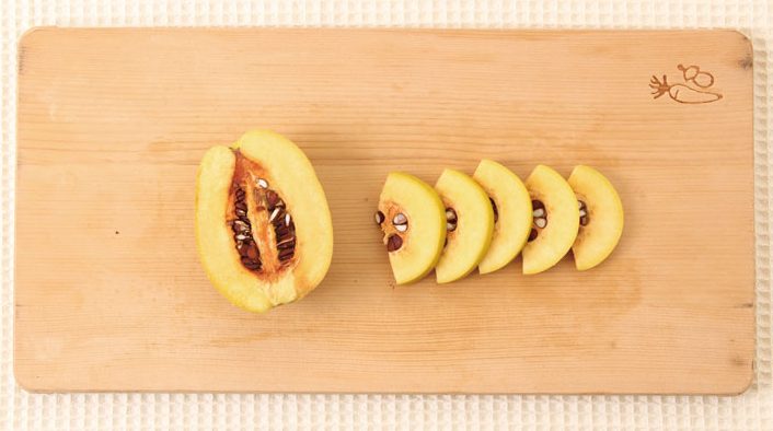 かりんは洗って水気をふき取り、輪切りにして広口ビンに種ごと全部入れます。