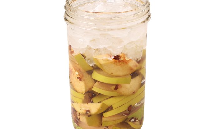 かりんシロップと同様に輪切りにし、種ごと氷砂糖とリカーで漬け込みます。