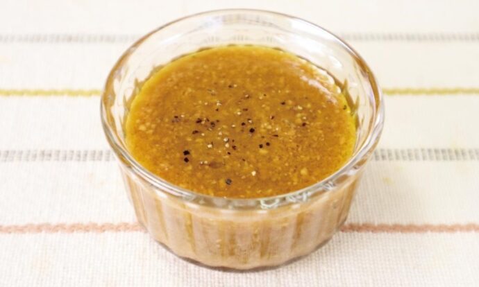 ボウルにオリーブオイル以外の材料を入れて混ぜ合わせる。均一に混ざったらオリーブオイルを少量ずつ加えてよく混ぜ合わせる。