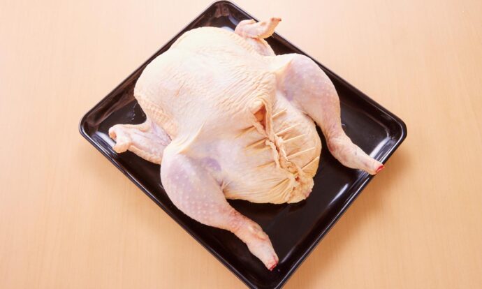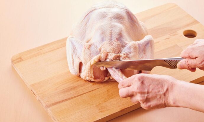 神山鶏1羽の下準備をする。首の皮を持ち上げ、首づるを切り離す。(切り離した部分はスープなど汁ものに使えます)にんにくはスライスする。塩15gを腹の中まで全体にすり込み、こしょうをふる。