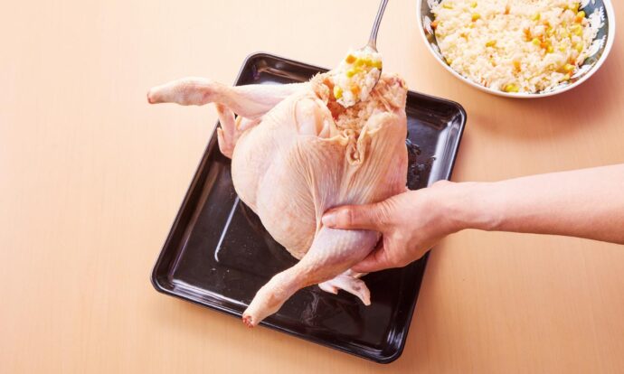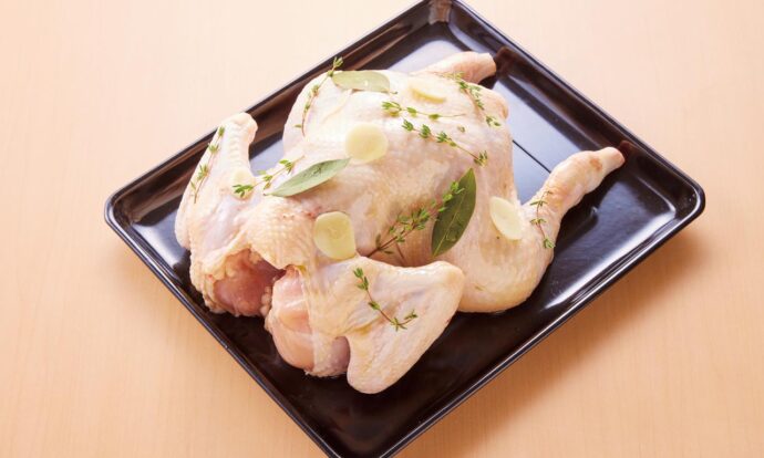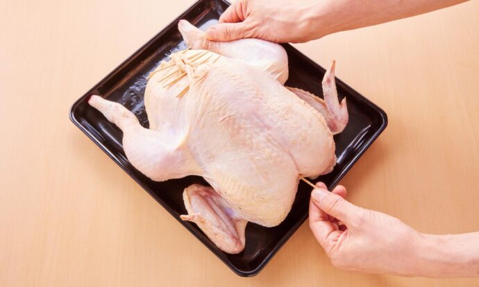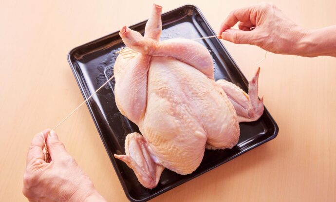 にんにくとハーブをとり除き、足をクロスさせて手羽先が広がらないよう、タコ糸で縛る。