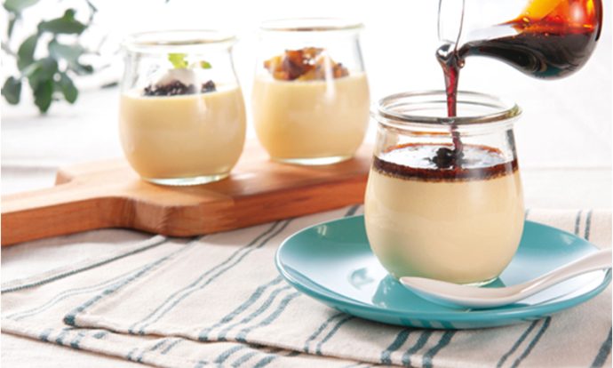 鍋に型の半分くらいの高さまで水を張り、火にかけ小さな泡がたってきたら(約90℃)、鍋底に布巾を敷いて①を並べて蓋(水滴が落ちないように蓋に大きめの布巾を巻いておく)をして、約10分ごく弱火で蒸す。そのまま10分置く。容器をゆすってみて表面に膜があり、中身が出てこなければ蒸し上がり。波打つようなら加熱して様子を見る。あら熱を取り、冷蔵庫で冷やしていただく。