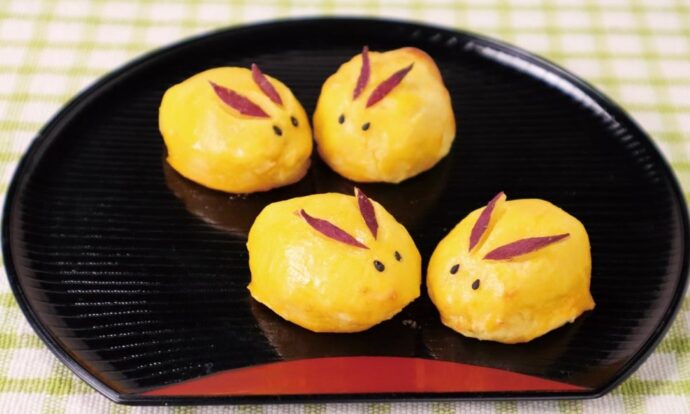 ②に卵黄をハケなどで表面に塗り、③を耳に、黒ごまを目に見立ててのせる。オーブントースターで10~15分焼く。