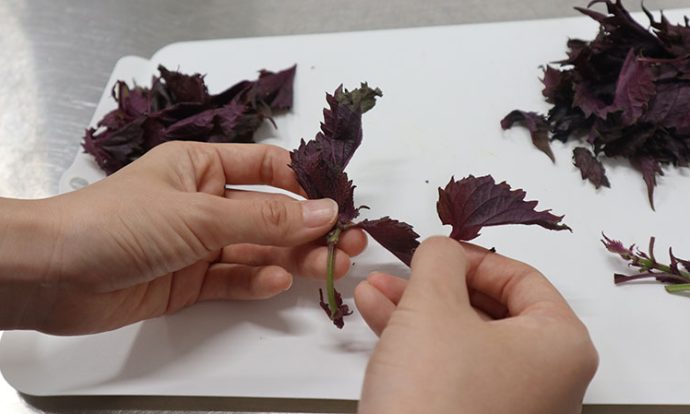 赤しそに大きい茎がついていたら取り除く。よく水洗いして水気をきっておく。