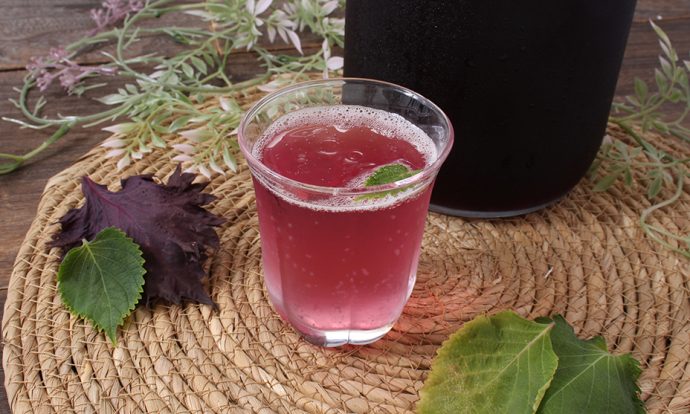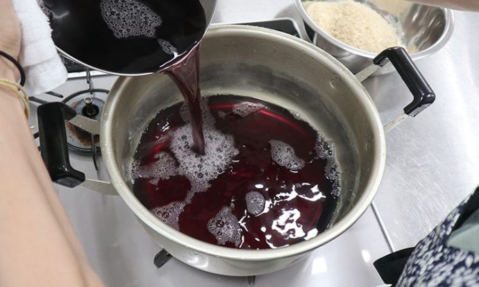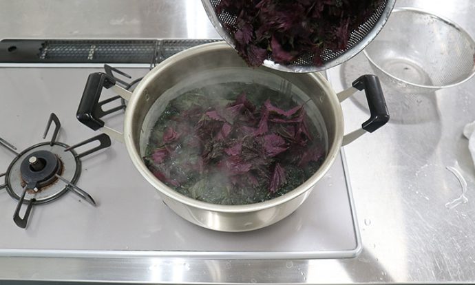 鍋に水1.8Lを入れて沸かし、赤しそを入れる。一度に入りきらない場合は、数回に分けて菜箸で押し入れていく。再度沸騰したら中火で10分ほど煮出す。