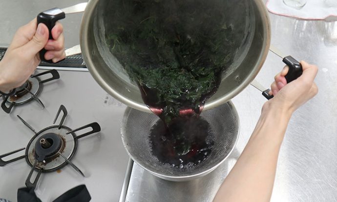 粗熱がとれたらざるで漉して葉をかるくしぼり、赤しそのエキスを出しきる。まだ熱い場合があるので、トング等で押さえつけるようにして赤しそを絞る。