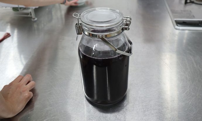 こしたエキスを鍋に戻し、砂糖を加えて弱火にかける。完全にとけたら火を止めて粗熱をとる。酢を加え、よく混ぜてから完全に冷ます。
