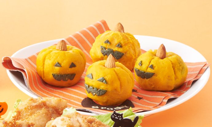 ②がさわれるくらいにさめたら、3~4等分にしてラップで包み、かぼちゃの形に整える。 つまようじや箸で縦に筋を入れ、かぼちゃの皮で目や口を作って付ける。アーモンドをへたの部分にさしこむ。