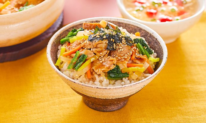 炊飯器の内釜に米を入れ、冷水を280ml入れる。にんじん、たまねぎ、胡麻油大さじ1/2、②を汁ごと入れて炊く。 器に盛り、錦糸卵といりごまをのせる。