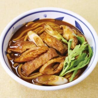 うどんを器に盛り、②を注ぎ①のチンゲンサイと豚キムチをトッピングする。
