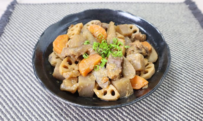 ごぼうは皮をこそげて5mm厚さの斜め切り、れんこんは7~8mm厚さの半月切りにし、それぞれ水に浸けてアク抜きをする。 にんじんは7~8mmの半月切りにする。 こんにゃくは厚さを半分に切り、表面に格子状の切り目を入れて一口大に切る。熱湯で1~2分茹でる。