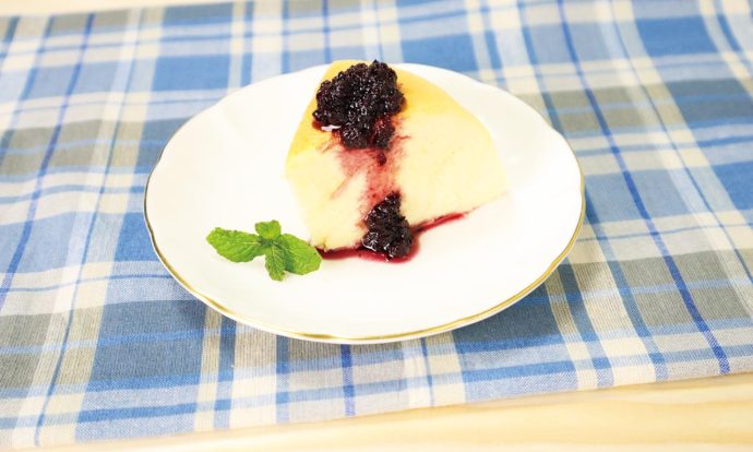 オーブンから取り出して冷まし、型のままラップをかぶせ冷蔵庫で一晩休ませる。 型から外して切り分け器に盛り、ブルーベリージャムをかけミントを添える。