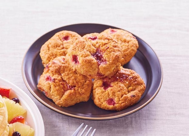 ボウルにホットケーキミックスと砂糖を入れて混ぜ合わせ、バターを加えてスケッパーで切るように混ぜる。バターが米粒大になったら両手ですり合わせてなじませ、牛乳を加えてゴムベラで混ぜる。粉っぽさが残っているくらいでいちごを加えて混ぜ、手で生地をまとめる。10等分にし、いちごジャムを包むようにして中に入れて丸める。