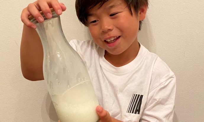 空き瓶などにノンホモ牛乳を200ml入れる。蓋がしっかりとしまっているのを確認したら、力をこめて思いっきりふりふりする。