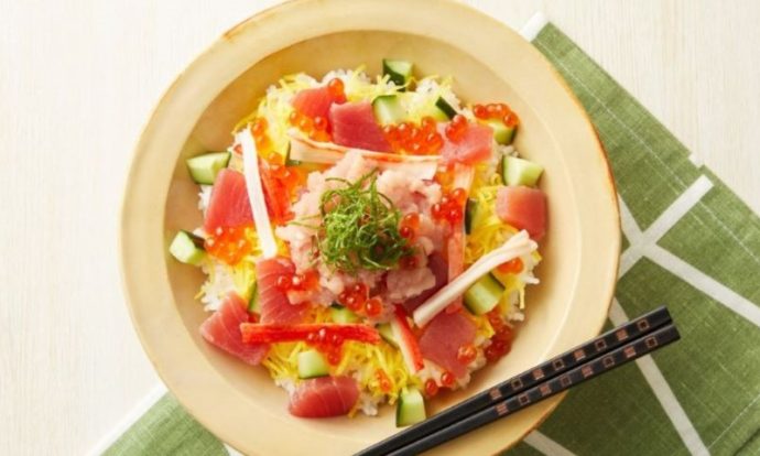 粗熱が取れたごはんを器に盛り、錦糸卵を全体に広げてマグロ、かにかま、きゅうり、ねぎとろ、いくらをのせ、小口切りにしたあおねぎをちらす。