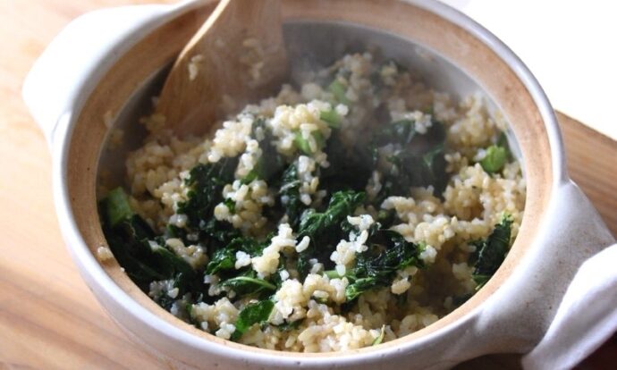 米は研いで30分浸水する。ケールは洗って葉の部分を食べやすい大きさに切り、茎の部分は刻む。